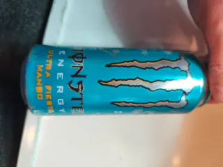 Lata de bebida energética Monster. - Sabor Ultra Fiesta Mango. - Diseño llamativo en color azul y plateado.
