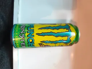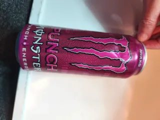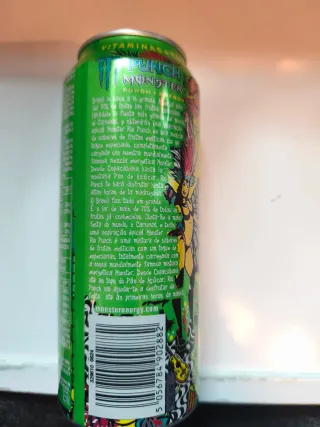 Lata de bebida energética Monster Punch. - Diseño llamativo con colores vibrantes. - Sabor a punch tropical.