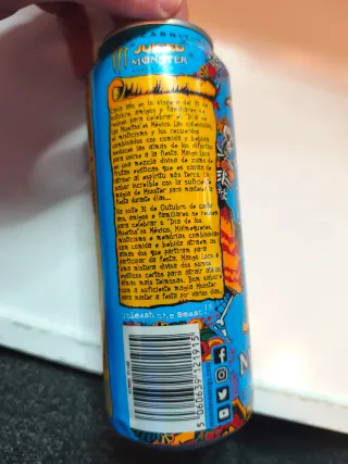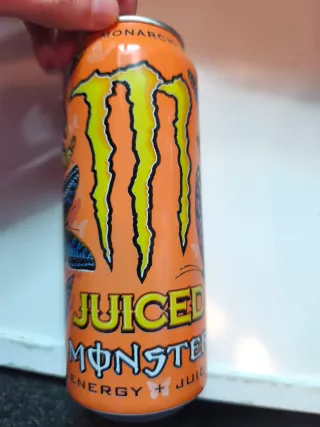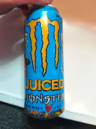 Lata de bebida energética Monster. - Diseño azul con el logo Monster. - Texto JUICED MONSTER visible.