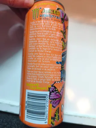 Lata de bebida energética Monster Juiced Monarch. - Diseño naranja con mariposas. - Sabor a zumo.