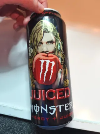 Lata de bebida energética Monster. - Sabor Apple. - Diseño con ilustración.