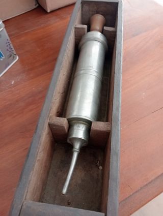 Lavativa, jeringa, irrigador antiguo en su caja de madera antigua. Posiblemente usado en animales Medidas de la lavativa: 37*5 Medidas caja de madera: 41'5*10*8'5
