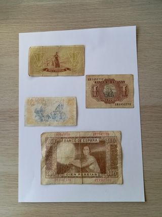 Colección de billetes antiguos de España. Son piezas con señales de uso y paso del tiempo, lo que les da un encanto especial. - Incluye cuatro billetes de 1 peseta y dos de 100 pesetas. - Algunos muestran imágenes de personajes históricos y escenas representativas. - Perfectos para coleccionistas o amantes de la historia. De la republica Española. Consejo de Asturias y Leon Banco de España.