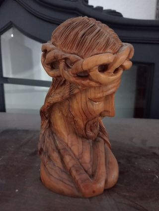 Preciosa talla de madera de Jesús con corona de espinas. Es una pieza única, ideal para coleccionistas o devotos. - Tallada en madera de olivo. - Muestra detalles delicados en el rostro y la vestimenta. - Conserva un hermoso color natural de la madera.