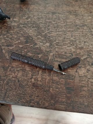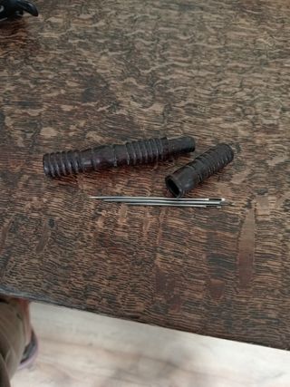 Canutero precioso antiguo para ñlevar agujas de coser. Se compone de dos piezas de madera oscura, con un diseño estriado. Incluye tres agujas de coser de metal. - Estuche de madera tallada. - Dos agujas incluidas. - Ideal para costura o coleccionistas.