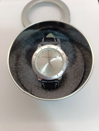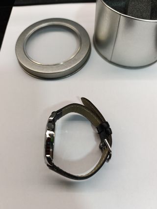 Reloj de pulsera con correa negra. - Esfera plateada con números y marcas. - Correa de cuero negra. - Diseño sencilla. Estado: nuevo, usado 1 sola vez, y con el embalaje original (ver fotos). También podría quedar en LOGROÑO, BURGOS y VALLADOLID. Se hacen envíos.