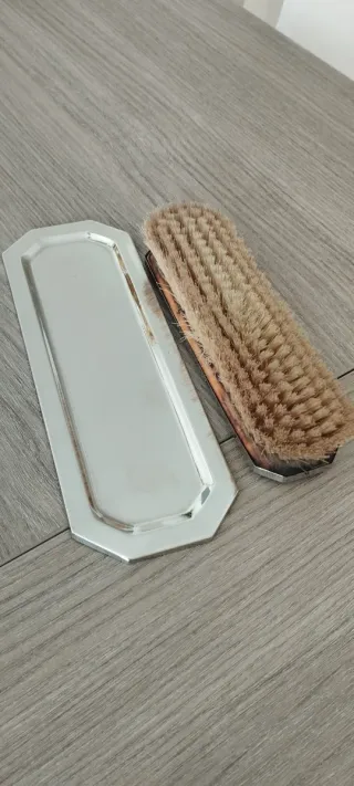 Set de cepillo para ropa plateado con bandeja. Serigrafiado el escudo de Catalunya. - Diseño elegante en color plata y marrón.