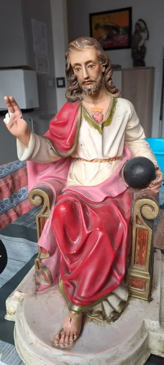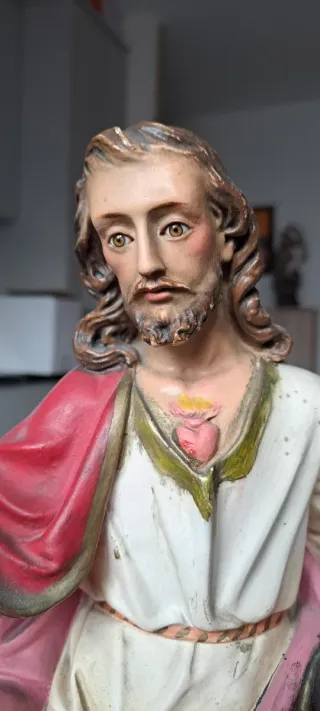 Figura religiosa del Sagrado Corazón de Jesús, estilo Olot. - Representación detallada de la figura. - Colores vivos y acabados tradicionales. Tiene un gesto natural y unos colores vivos preciosos. Le falta la corona y le cruz. Tendría para restaurarle la mano como se ve en las fotos. Son detalles , el resto está perfecto... Negociable.