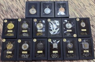 Conjunto de quince relojes de bolsillo a cuerda, coleccion Salvat Pocket, Mechanical Watch, cada uno presentado en su caja individual. Mecanismo a la vista. Nunca usados. - Diseños variados y ornamentados. - Incluyen cadenas a juego. - Cajas de presentación negras.