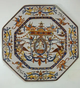 Vendo por 20€ plato octogonal de cerámica, dibujado a mano,con diseño de figuras mitológicas; querubines, grifos y motivos vegetales. El borde está decorado con azul y dorado. Acabado brillante.