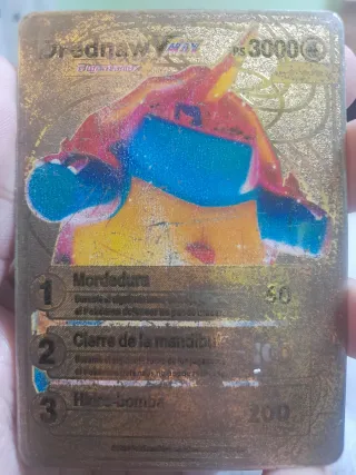 Carta Pokémon de Drednaw VMAX con acabado dorado y 3000 PS. - Ataque 1: Mordedura (60) - Ataque 2: Cierre de la mandíbula (100) - Ataque 3: Hidro-bomba (200)