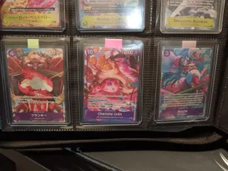 Lote de cartas del juego de cartas coleccionables de One Piece. - Incluye cartas de personajes como Satori y Portgas D. Ace. - Algunas cartas muestran texto en japonés. - Las cartas están protegidas en fundas.
