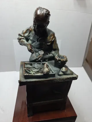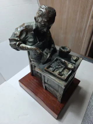 Figura antigua de bronce patinado que representa a un zapatero trabajando. Una pieza con gran detalle. Estado como se ve en fotos bien. Peso 3560 gramos. Medidas 28x18x16. - Material: Bronce patinado. - Representación: Zapatero artesano. - Base: Incluye base de madera.