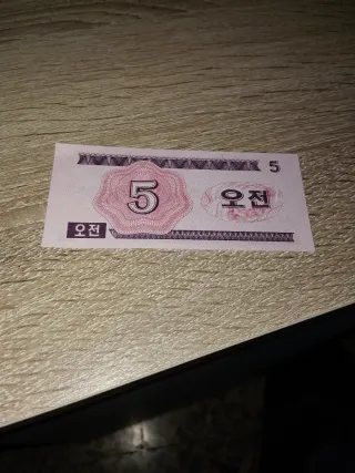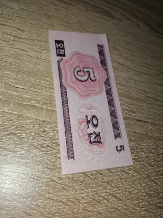 Billete de 5 Won de Corea del Norte. - Diseño con el número 5. - Texto en coreano.