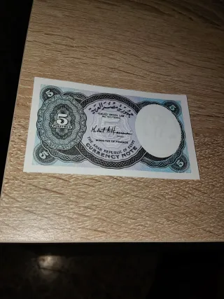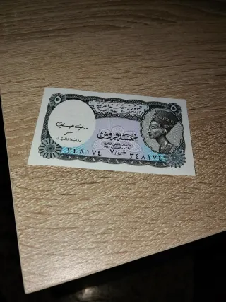 Billete de 5 libras de Egipto emitido en 1940. Presenta un diseño detallado con la figura de Nefertiti. - Emisión: República de Egipto. - Valor: 5 Libras. - Fecha de emisión: 1940. - Diseño: Figura de Nefertiti.