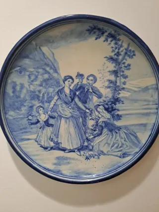 Precioso plato decorativo de cerámica, con un diseño pintado a mano en azul cobalto sobre fondo blanco. Representa una escena campestre con figuras.Segundo catálogo 1915. - Mide 28 cm de diámetro. - Cerámica pintada a mano. - Diseño tradicional Talavera. - Firmado por Ruiz de Luna.