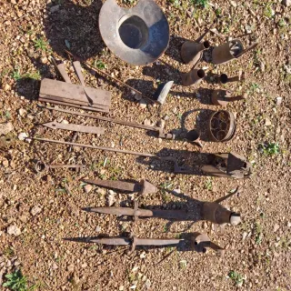 Conjunto de herramientas antiguas de metal y madera, con un aspecto rústico y vintage. - Incluye una variedad de piezas como regaderas, linternas, llaves y otros utensilios. - Ideal para coleccionistas o decoración temática.