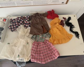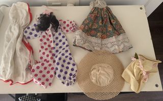 Lote de ropa para muñecas vintage, ideal para coleccionistas de los años 70 y 80. Incluye: - 14 prendas de diferentes tallas - 7 complementos variados - Vestido floral con encaje. - Traje de lunares morados y rosas. - Capa blanca con ribete rojo. - Sombrero de paja. - Conjunto amarillo con detalles rosas.