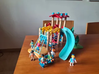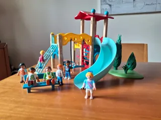 Se vende un lote de figuras y accesorios de Playmobil - Parque infantil con tobogán y columpios. - Figuras de niños y niñas. - Árboles decorativos.