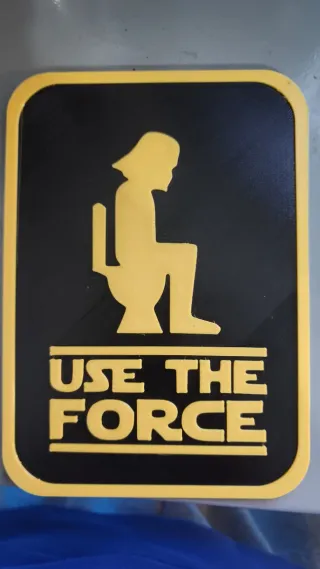 Cartel decorativo con diseño Use the Force. Fabricado con tecnología de impresión 3D. - Material: Plástico PLA. - Diseño: Silueta de Darth Vader en el inodoro con texto. - Color: Negro y amarillo.