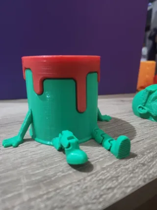 Original portalápices fabricado con impresión 3D. Su diseño único incluye piernas articuladas que le dan un toque divertido. - Color principal: verde. - Detalle superior: rojo. - Piernas articuladas y móviles.