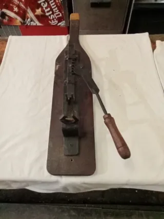 Sacacorchos antiguo con base de madera y mecanismo de hierro largo 63 ancho 12,5 falta el espiral de sacar el corcho
