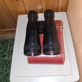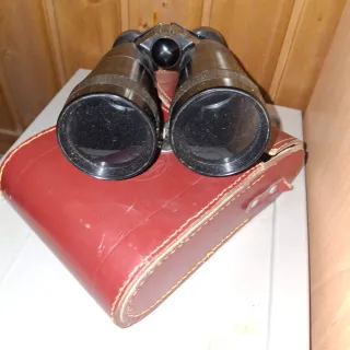 Binoculares clásicos en color negro, acompañados de su estuche original en tono rojo. - Diseño vintage. - Estuche de cuero con costuras visibles. - Cierre de botón a presión en el estuche.