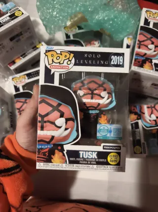 Figura Funko Pop de Tusk de Solo Leveling, edición de 2019. Es una figura limitada a 9500 piezas y brilla en la oscuridad. - Edición limitada a 9500 piezas. - Brilla en la oscuridad (Glows in the Dark). - Personaje: Tusk. - Serie: Solo Leveling. - Año: 2019.