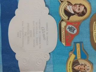 Conjunto de vitolas de puros de la marca Álvaro. Cada vitola presenta un diseño distintivo con retratos de personajes históricos. - Diseños variados con retratos. - Marca: Álvaro. - Ideal para coleccionistas. - Aparece: . Felipe II . Liuva II . Sigerico . Eurico . Ramiro I . Mauregato . Wamba . Franz Liszt . Elias Metchnikofd . Don Quijote de la Mancha (6) . Vizconde Cecil de Cheleood . Archibald V. HILL . U. von Euler ESCUCHO OFERTAS HAGO ENVÍOS
