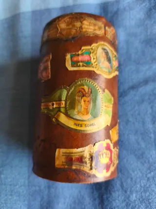 Original cubilete portalápices artesanal fabricado en cuero curtido y decorado con vitolas/anillas de puros. Hecho a mano. - Material: Cuero. - Decoración: Vitolas de puros. - Estilo: Antiguo.