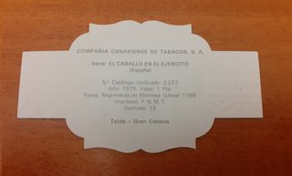 Vitola de la Compañía Canariense de Tabacos, con el sello del Regimiento de Montesa (1788) de 1975, con valor de 1 peseta. Pertenece a la serie El caballo en el Ejército de España. Bastante bien conservado. Precio no negociable. Escribir antes de comprar directamente. Entrega en mano en metro/renfe Delicias. ENVÍO (nacional): ordinario + 1 euro (total 3,25). Pago por bizum para envío.