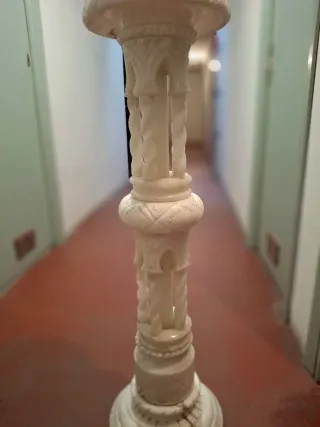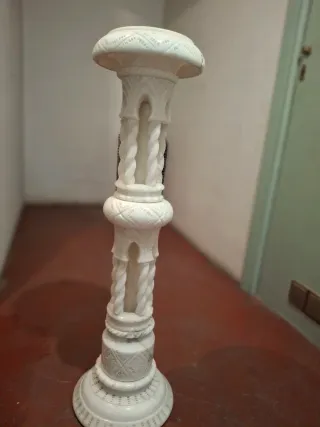 Figura decorativa de alabastro con un diseño intrincado y detallado. - Material: Alabastro - Color: Blanco - Diseño: Columna tallada con motivos ornamentales y base ancha.