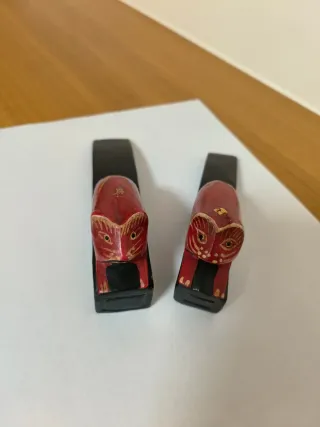 Conjunto de dos figuras decorativas con forma de rata japonesa, pintadas en rojo y negro. - Diseño tradicional. - Detalles en dorado.
