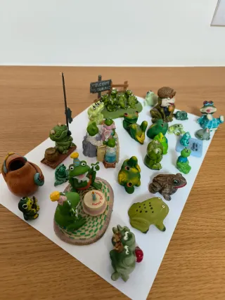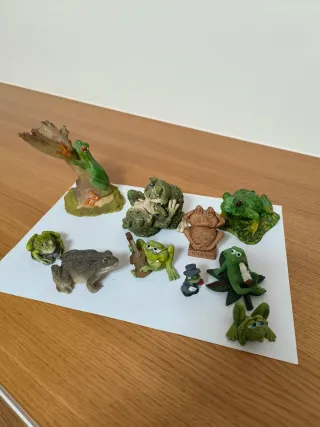 Conjunto de figuras decorativas de ranas. - Variedad de ranas con diferentes poses y diseños. - Ideales para coleccionistas o para añadir un toque divertido a tu hogar. - Fabricadas en material resistente.
