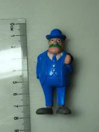 Figura coleccionable del Jefe Quimby o Gontier, personaje de Inspector Gadget de 1983 de Bandai hecho en Macao - Figura de plástico. - Detalle de traje azul y sombrero. - Bigote verde característico.