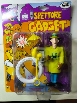 Figura de acción del Inspector Gadget en su empaque original. - Fabricado por Gigi en 1991. - Incluye accesorios como un salvavidas y un paraguas. - Presenta arte de DIC Enterprises. - La caja muestra la frase Carta della missione segreta inclusa!!.