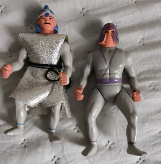 Dos figuras de acción tipo guerreros ninja, inspiradas en estilos como Jakse y Atosa. Ninja warriors tipo Guerreros Jakse Atosa juyba bootleg Enemigos del mal - Una figura viste un traje plateado brillante con detalles en negro. - La otra figura es de color gris con detalles morados. - Ambas figuras tienen cascos y brazos articulados.