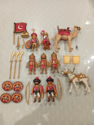 Conjunto de figuras y accesorios Playmobil inspirados en árabes sarracenos con motivos del Corán. El pack contiene dorcel, escudos y armas exclusivas. Son únicos no los fabrica Playmobil. Para completar tus dioramas medievales. Suelen durar poco cada vez que subo un lote. No te lo pienses!!!! TENGO MAS LOTES MEDIEVALES EN MI PERFIL. MUCHOS accesorios y armas para completar tu castillo. MUY EXCLUSIVO.Chevalliers, edad media ,molden age, sudistes, castillo, torneo, dragón, toro, nordistas, torneo, cruzados, caballos, torneos, Chateau,... VISITA MI PERFIL TENGO MUCHOS PLAYMOBIL 🟤🟤🟤🟤