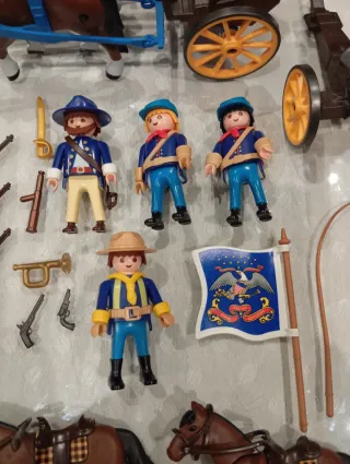 Set de Playmobil que incluye un carro con caballos y figuras de caballería ambientado en la Guerra Civil Americana, representando soldados nordistas de caballería y accesorios con general, carro y cañón. TENGO MUCHOS LOTES DEL OESTE EN MI PERFIL. Diligence, gold transporte, western, Cañón, carro, armas, US CAVALLERIE, Piratas, victoriano, napoleónicos, soldados, barcos, sudistas, nordistas, pirates, nordistes, sudistes ... MIRA MI PERFIL SI BUSCAS REFERENCIAS EXCLUSIVAS PLAYMOBIL!!!🟤🟤🟤🟤