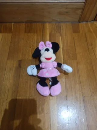 Adorable muñeca de Minnie Mouse con un vestido rosa. - Vestido rosa con lunares blancos. - Lazo rosa en la cabeza. - Zapatos rosas.