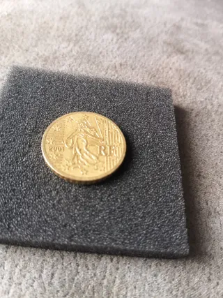 Moneda de 50 céntimos de euro, acuñada en Francia en el año 2002. - Diseño de la cara nacional con la figura de Marianne. - Inscripción RF (République Française). - Borde con estrellas y líneas verticales.
