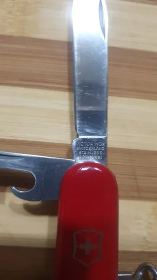 Navaja Victorinox Climber fabricada entre 1985 y 1991. Muy buena condicion. Signos de uso normal. Ha sido lavada y lubricada. Modelo de entre 1985 y 1991. El sacacorchos tiene una hendidura que recorre la espiral y el punzón tiene ojal, lo cual lo data despues de 1985. No incluye ni agujero para guardar la aguja ni gancho, cosa que empezaron a implementar en el 91. Estas características sitúan la pieza en el periodo anteriormente mencionado. Incluye hoja principal, hoja pequeña, abrelatas, destornillador Phillips y plano, sacacorchos, tijeras, punzón, palillo de dientes y pinzas.