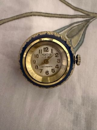 Este es un reloj colgante de la marca Mortima. - Esfera con números arábigos. - Bisel azul. - Mecanismo de 17 rubíes.