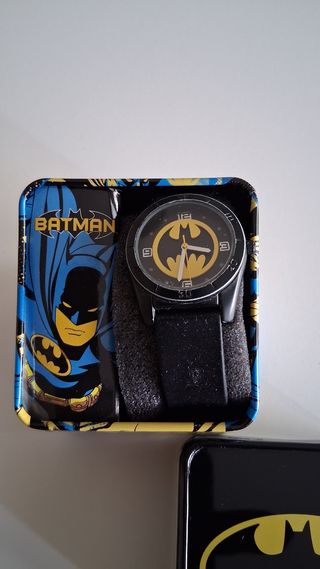 reloj oficial de Batman para niños. Diseño: Cuenta con el famoso logotipo de Batman en la esfera y la caja es de color plateado con detalles en "Batman Yellow". La correa es de silicona con una hebilla.25 cm. Es un reloj analógico de cuarzo, diseñado para ayudar a los niños a aprender a decir la hora. no es resistente al agua. Tiene desgastes en la parte de atrás del reloj. Tiene pila.