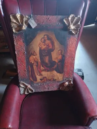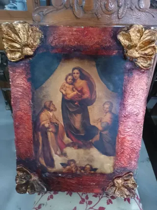 Reproducción de la obra maestra La Madonna Sixtina de Rafael Sanzio, enmarcada artesanalmente con detalles en relieve en las esquinas en cartón piedra y pintado a mano. Medidas: 60 x 46 cm - Lámina de alta calidad. - Marco de estilo artesanal con detalles dorados y textura rojiza. - Representación de la Virgen María con el Niño Jesús, San Sixto y Santa Bárbara, y dos querubines. Más artículos originales y antigüedades en mi perfil Instagram: @almadecolibri13 @erlaunlugarparasoñar13 WhatsApp: 679658776