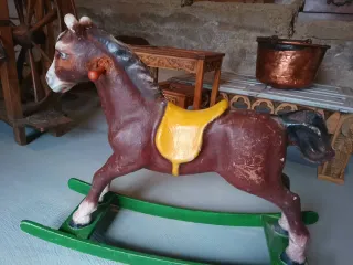 Caballito balancín vintage de cartón piedra, fabricado en los años 50. Un clásico para decorar o para los más pequeños. Medidas: 86 cm largo x 26 cm ancho x 66 cm alto - Material: Cartón piedra. - Época: Años 50. - Color: Marrón con detalles en amarillo y verde. Más artículos originales y antigüedades en mi perfil Instagram:@almadecolibri13 @erlaunlugarparasoñar13 WhatsApp: 679658776