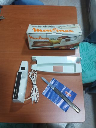 Se vende cuchillo eléctrico Moulinex, modelo 294, con su soporte. Antigüedad funcionando perfectamente, en su embalaje y folleto original, completamente nuevo, de colección. - Incluye el cuchillo eléctrico. - Viene con su soporte. - Incluye las cuchillas con su funda - Caja original. - Folleto de origen, tal cual se conpro, no se uso