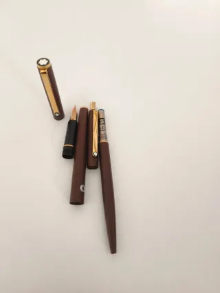 Conjunto de pluma y bolígrafo Montblanc en color marrón. Pluma estilográfica Vintage, fabricado entre los años 1976 - 1980 en metal marrón, brown. Detalles y clip bañados en. Plumín monocolor de color oro. Carga: Cartuchos ( no incluido). Bolígrafo marrón y dorado. - Diseño elegante con detalles dorados. No contiene estuche