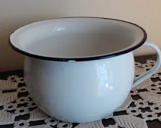 Orinal de porcelana de color blanco con borde azul. - Diseño clásico. - Asa lateral para facilitar su manejo.