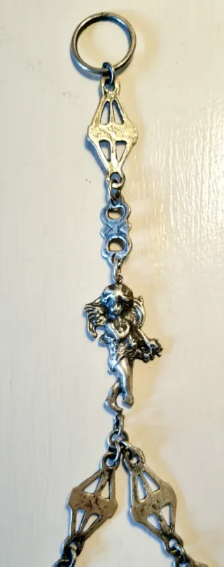 Precioso sonajero antiguo con un diseño detallado. - Figura central de un ángel. - Base con rostro de querubín y alas. - Colgantes de cascabeles en la parte inferior.